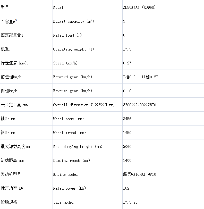 產(chǎn)品詳情 ZL50E(A) (XD968) 6.0噸井下裝載機(jī) 在線咨詢 產(chǎn)品詳情 ●玉柴增壓發(fā)動機(jī),經(jīng)過優(yōu)化配比的BS306型雙變,加重型減速車橋,速比降低,牽引力增加20%,低檔鏟裝更有力,工作效率更高。 ●氣推油鉗盤式制動,17.5-25輪胎,自動放平功能。 ●加重型車身,更加堅(jiān)固,輪胎附著力更高。 ●鏟斗主板采用舞鋼生產(chǎn)的耐磨500特鋼鋼板,經(jīng)久耐用; ●整機(jī)長度≤8.0米,整機(jī)寬度≤2.4米,整機(jī)高度≤2.7米(到簡易棚尺寸),更窄、更矮、更短,適應(yīng)4×4巷道工作。 ●自帶補(bǔ)水式尾氣凈化裝置。 ●選裝氧化催化器; 輪胎保護(hù)鏈。